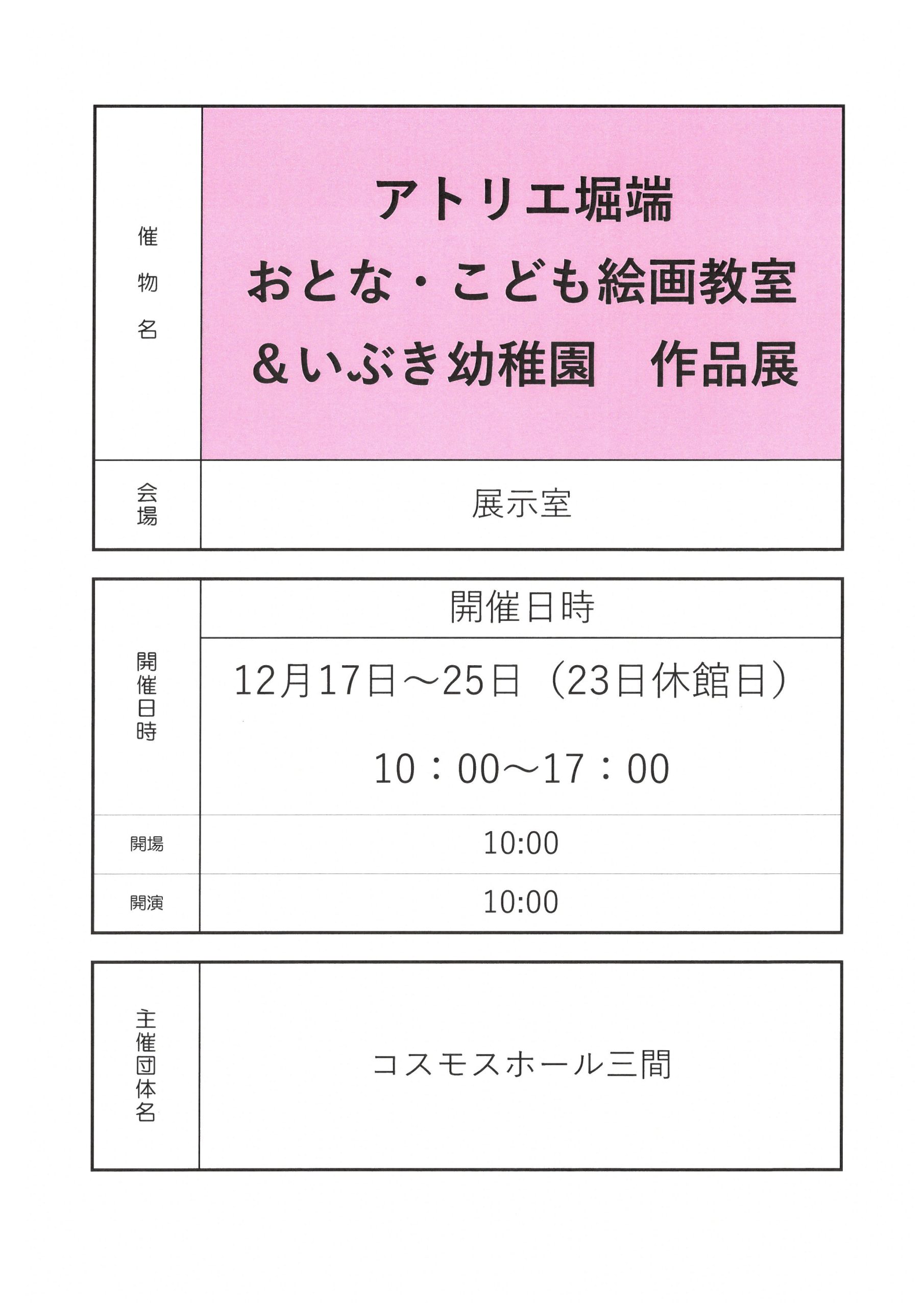 アトリエ堀端おとな・こども教室&いぶき幼稚園 作品展示 12月17日(水)~25日(木)22日休館