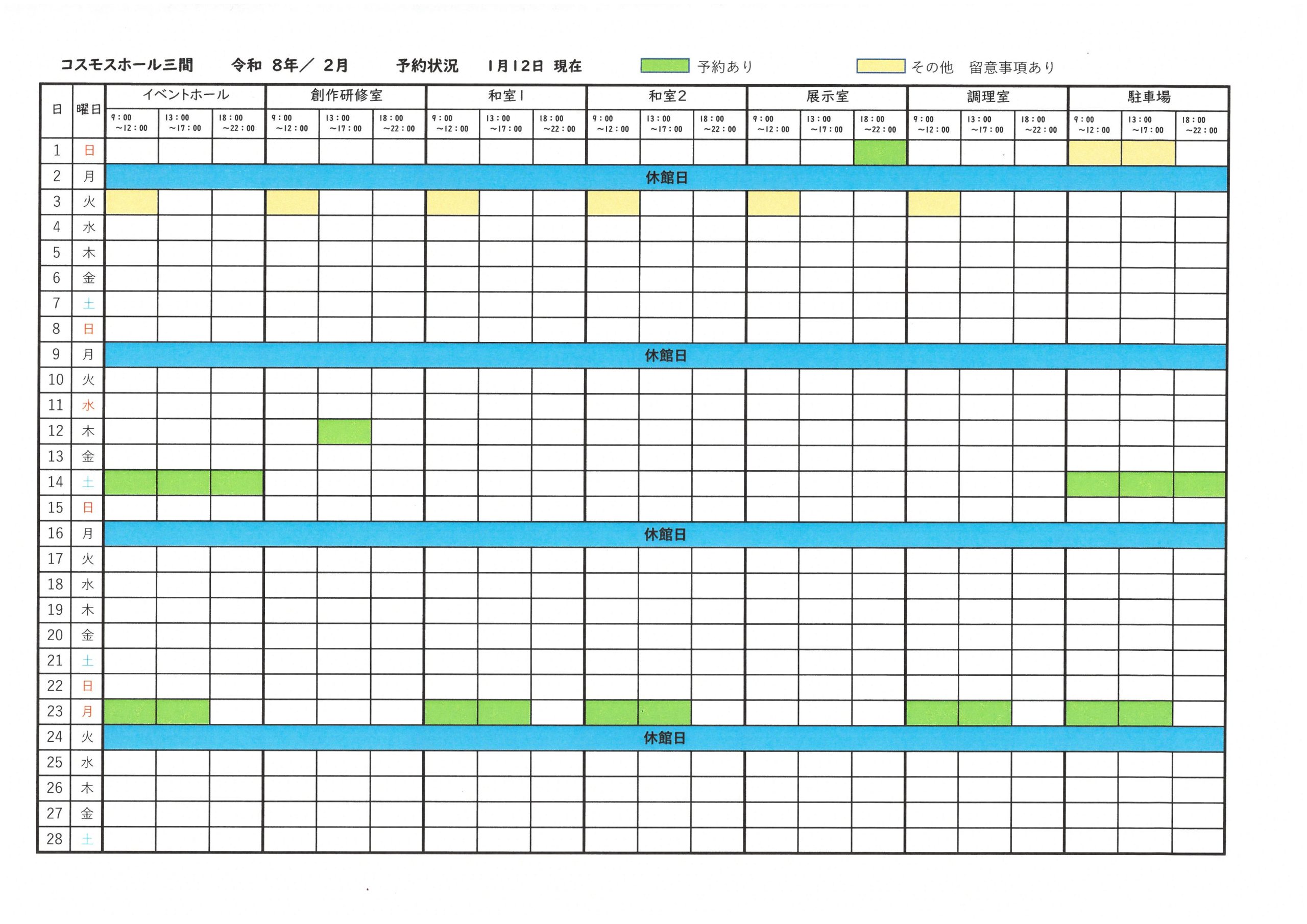 令和8年2月予約状況を更新しました