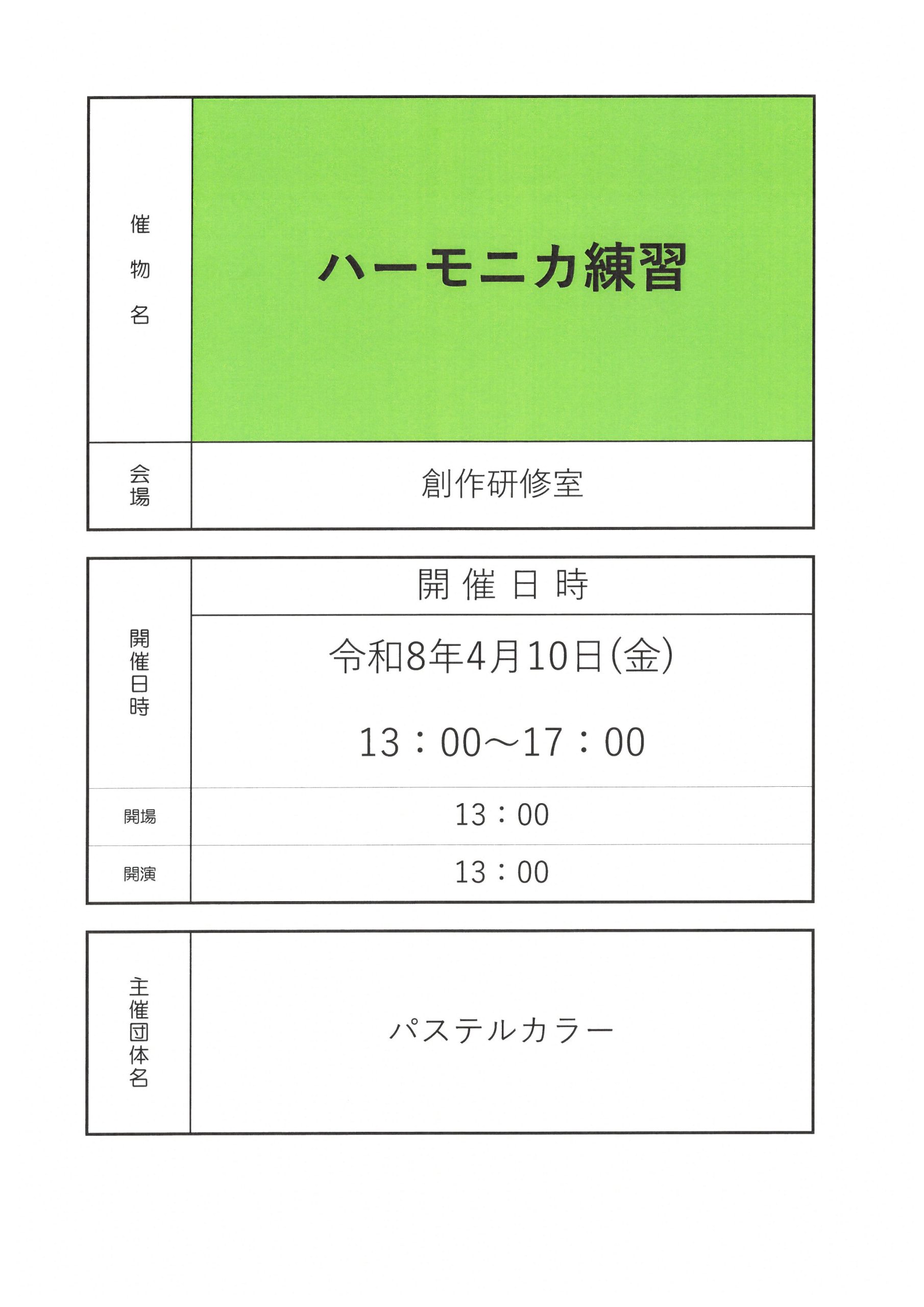 2026/4/1007:30: フォークリフト繧繝技能講習 / 陸上貨物運送事業労働災害防止協会07:30: フォークリフト繧繝技能講習 / 陸上貨物運送事業労働災害防止協会13:00: ハーモニカ練習 / パステルカラー13:00: ハーモニカ練習 / パステルカラー |