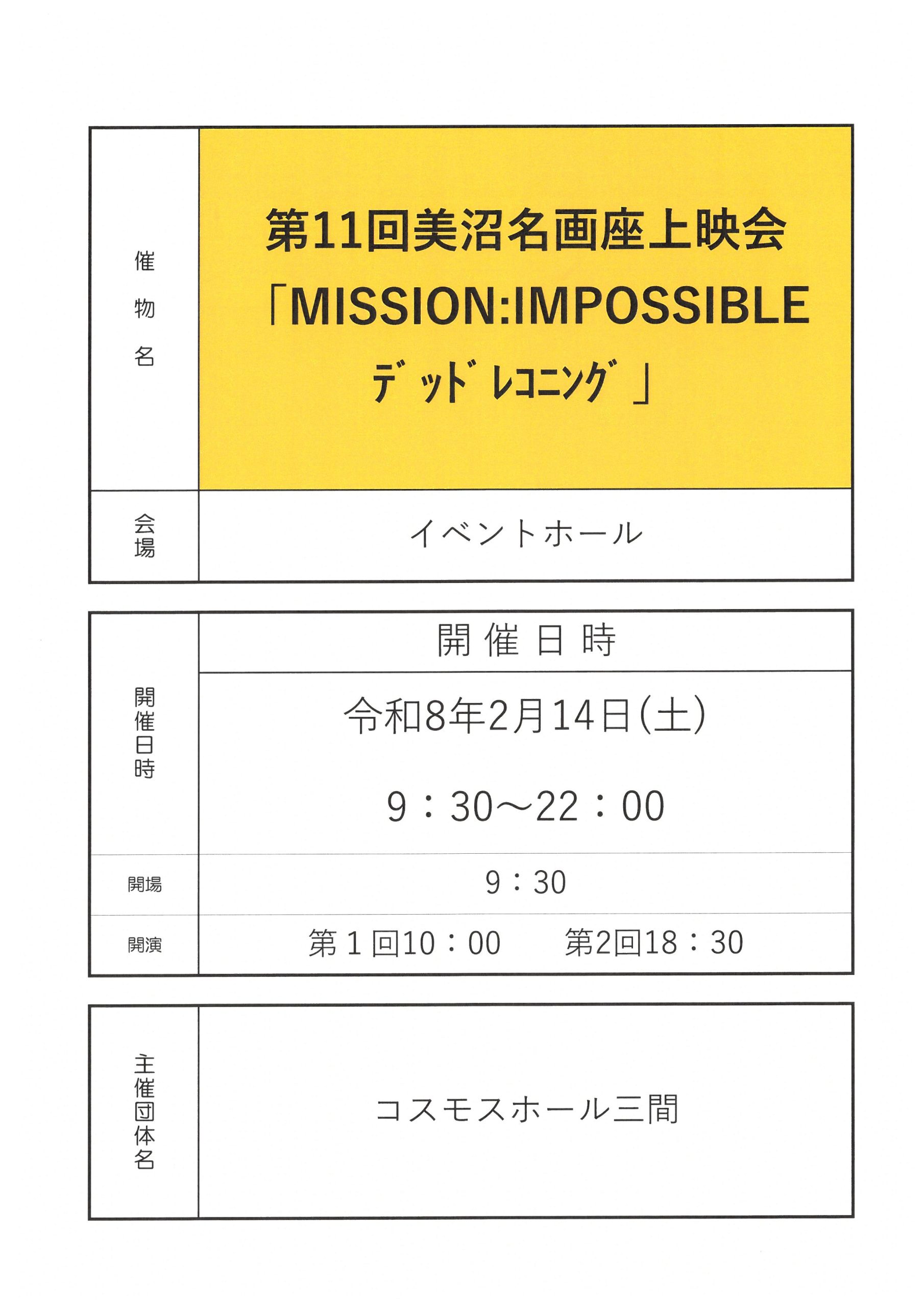 第11回美沼名画「ミッション:インポッシブル」デッドレコニング/コスモスホール三間第11回美沼名画「ミッション:インポッシブル」デッドレコニング/コスモスホール三間
