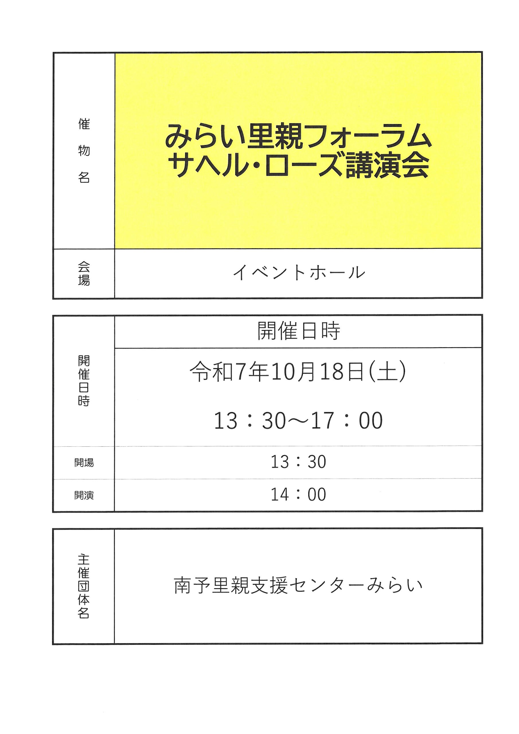 2025/10/17 | 2025/10/1813:30: みらい里親フォーラム サヘル・ローズ講演会 / 南予里親支援センターみらい13:30: みらい里親フォーラム サヘル・ローズ講演会 / 南予里親支援センターみらい |